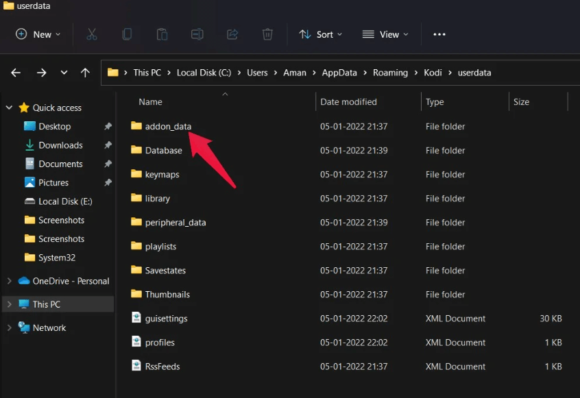 4. Burada birkaç klasör ve dosya göreceksiniz. Tüm klasörlerden,addon_dataKodi'den eklentileri kaldırmak için klasör.