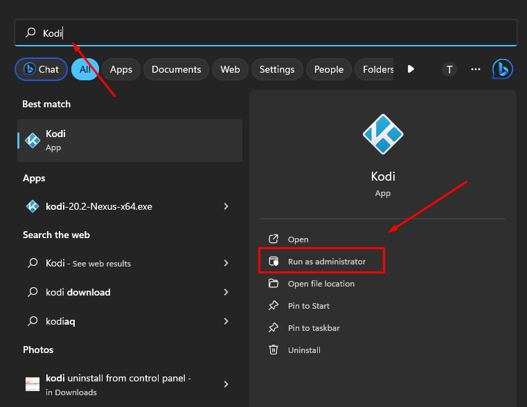 2. Sağ tıklayınKodiVe sonra tıklayınYönetici olarak çalıştır.