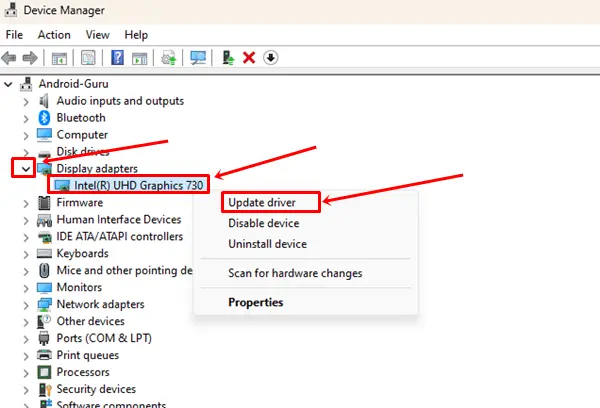 En son grafik sürücülerinin Kodi'yi Windows 11'de çalıştırması gerekmektedir. Grafik sürücüleriniz güncellenmezse, bu da bu soruna neden olabilir. KODI-'deki çarpışma sorunlarını çözmek için adımları izleyerek PC'nizdeki grafik sürücülerini güncelleyin.