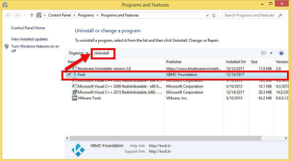 2. Bir sonraki ekranda seçinKodiVe sonra tıklayınKaldırmak. TıklayınKaldırmakYine Kodi'yi kaldırmak için.