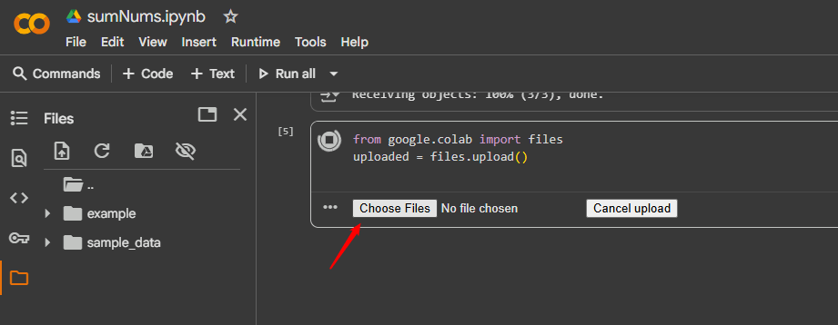 uploaded = files.upload()Bu not defterini çalıştırdığınızda, bir dosya yüklemenizi ister. TıklayınDosya Seçinİhtiyacınız olan herhangi bir dosyayı seçmek ve yüklemek için düğme.