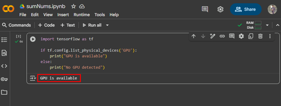print("No GPU detected")Bir GPU aktifse, kullanılabilirliği onaylar; Aksi takdirde, GPU bulunmadığını belirten bir mesaj görürsünüz.
