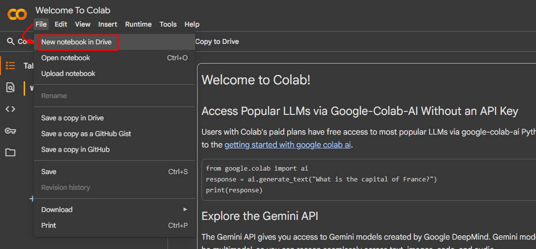 Alternatif olarak, ana sayfaya gidebilir ve seçebilirsiniz.Dosya->Drive'da yeni dizüstü bilgisayarmenü çubuğundan.