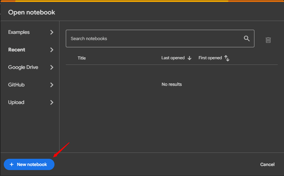 Google Colab'ı kullanmak içinGoogle Colab web sitesiardından Google hesabınızla oturum açın. Sayfa açıldıktan sonra, farklı seçeneklere sahip bir açılır pencere göreceksiniz.