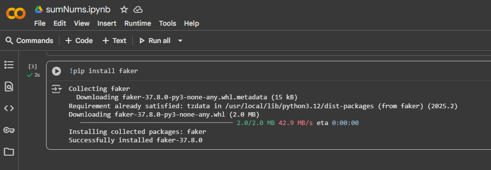 Colab'da daha kullanışlı bir özellik, python paketlerini PIP ile yerel bilgisayarınızda olduğu gibi yükleyebilmenizdir. Bu, ihtiyacınız olan herhangi bir kütüphaneyi getirmeyi kolaylaştırır. Örneğin, Faker kullanmak istiyorsanız, sadece çalıştırın:
