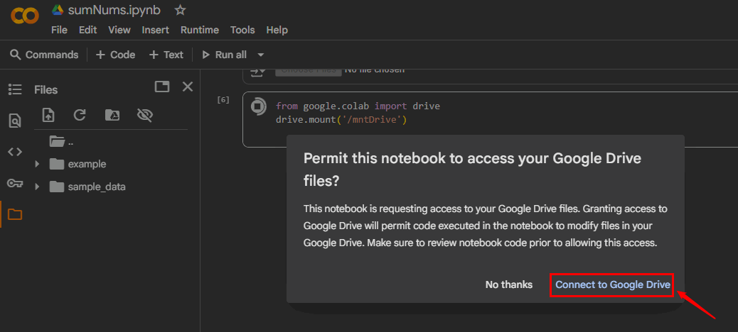 drive.mount('/mntDrive') Tabii ki, Google Drive'ınıza erişmesi için izin vermeniz gerekir.