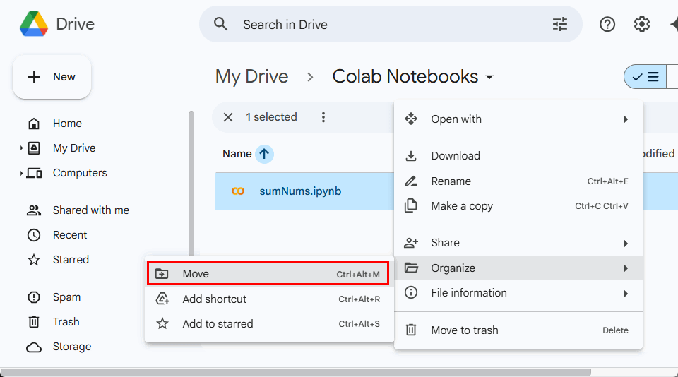 Google Colab'da, tüm not defterleri Google Drive'ınızda saklandığından çalışmanızı düzenli tutmak basittir. Bir dizüstü bilgisayarı normal dosyalar gibi sürücüdeki herhangi bir klasöre taşıyabilirsiniz. Bu, projeleri ayırmayı ve her şeyi düzenli tutmayı kolaylaştırır.