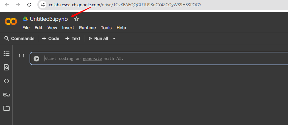 Varsayılan olarak, not defterine “Untitled.ipynb” olarak adlandırılacak ve Google Drive'ınıza kaydedilecektir. Başlığı sol üstte tıklayabilirsiniz.yeniden isimlendirmekve sonra Python kodunuzu yazmaya başlayın.