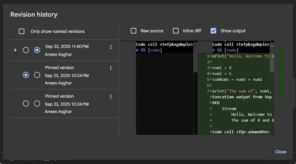 Başka bir yararlı özellik versiyon geçmişidir. Colab ilerlemenizi otomatik olarak kaydeder ve bir şeyler ters giderse not defterinizin önceki sürümlerini geri almak ve geri yüklemek için sürüm geçmişini kullanabilirsiniz. Bunu yapmak için tıklayınDosyaVe sonra seçRevizyon tarihiaçılır listeden.