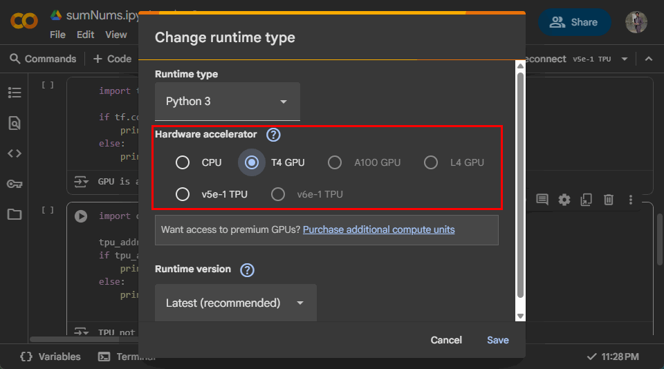 Google Colab'da GPU veya TPU'yu etkinleştirdikten sonra, dizüstü bilgisayarınızın gerçekten seçilen donanıma bağlı olduğunu doğrulamak iyi bir fikirdir. Örneğin, GPU'ları kontrol etmek için TensorFlow ile basit bir test yapabilirsiniz: