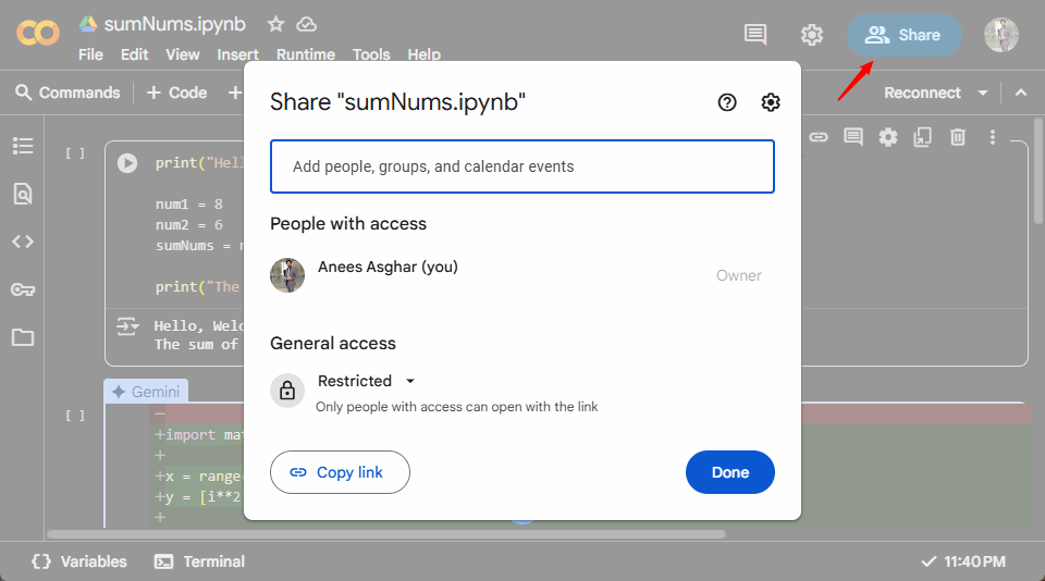 Google Drive'da bir dosyayı paylaşmakla aynı olan Google Colab, not defterinizi girerek paylaşmanıza olanak tanırE -posta adresleriveya tarafındanpaylaşılabilir bir bağlantı oluşturmakseçtiğiniz izinlere bağlı olarak başkalarının görüntülemek veya düzenlemek için kullanabileceği.