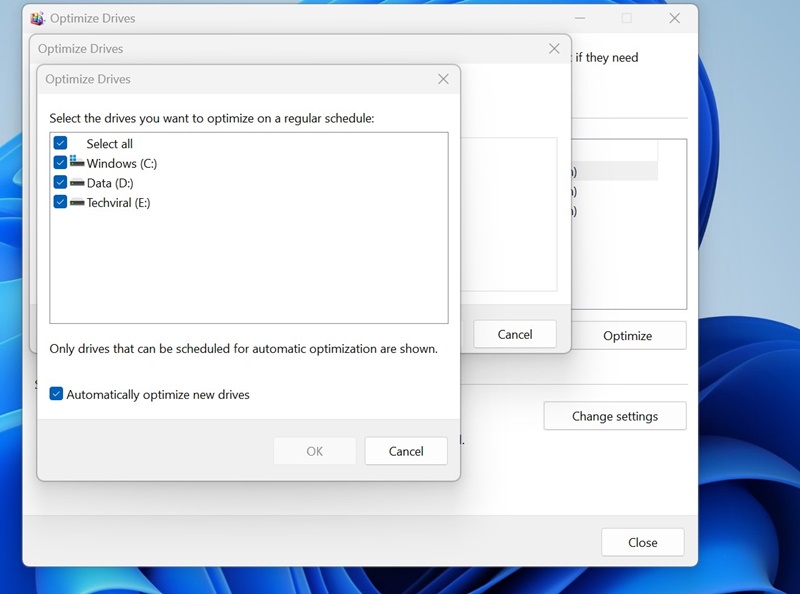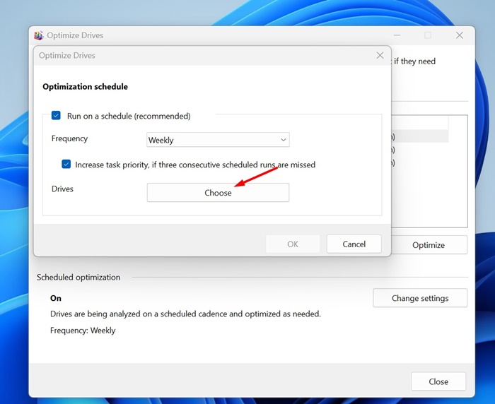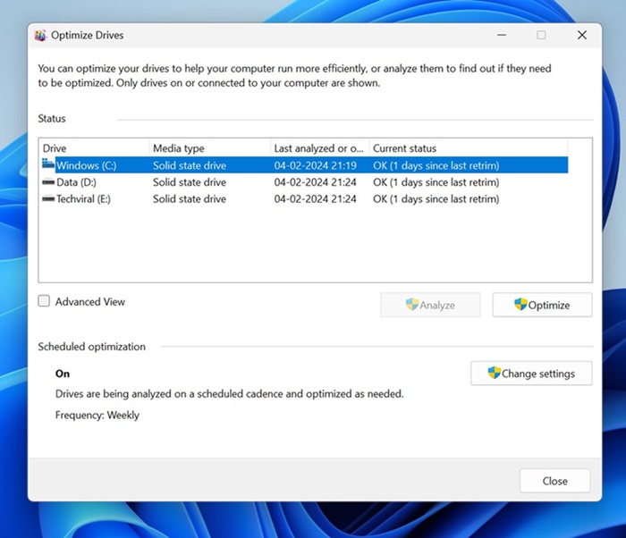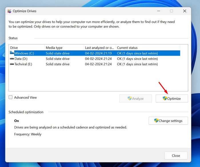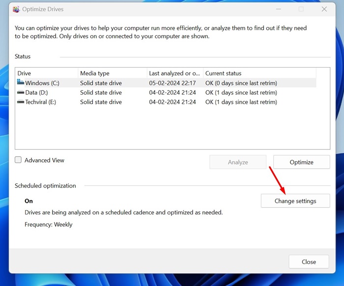 1. öğesine tıklayınAyarları DeğiştirSürücüleri Optimize Et aracındaki düğmesine basın.