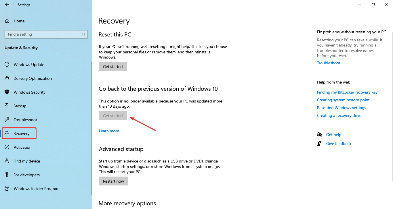 2. Şimdi, gezinme bölmesinden kurtarma seçin veBaşlamakWindows 10'un önceki sürümüne geri dönün. Unutmayın, bunu yalnızca bir güncelleme yükledikten sonraki on gün içinde yapabilirsiniz.