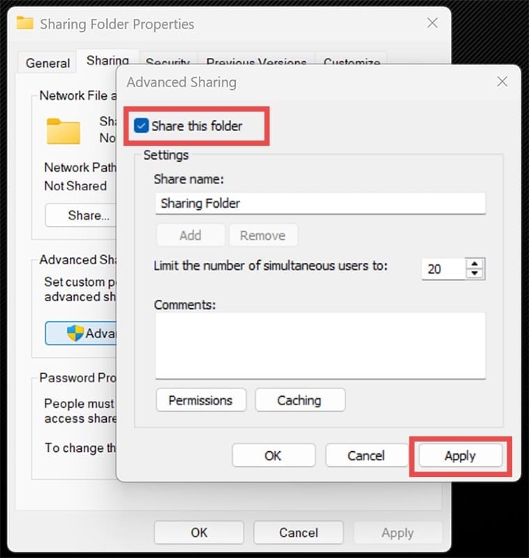 Adım 4.Yeni iletişim kutusunda "Bu klasörü paylaş" kutusunu işaretleyin ve "Uygula"yı seçin.