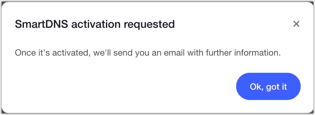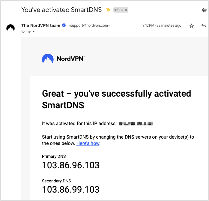 - MalısınBir E -posta Bildirimi AlınVPN hesabınız için SmartDNS etkinleştirilir etkinleştirilmez aktivasyon hakkında. E -posta ayrıca bir dizi birincil DNS ve ikincil DNS IPS içerecektir.