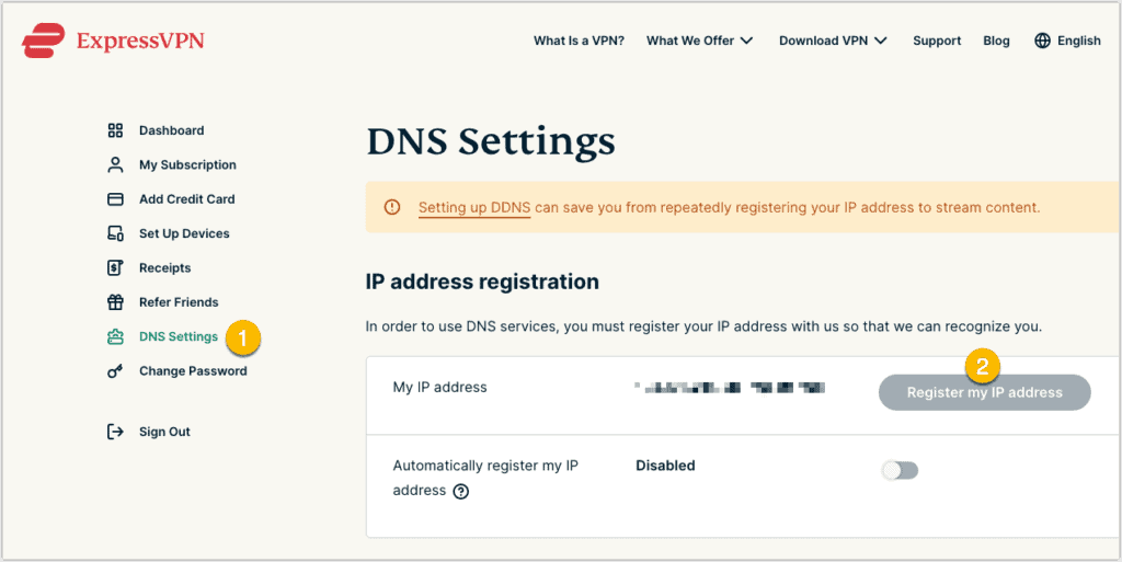 - DNS Ayarları> IP Adresi Kaydı'na gidin ve IP Adresi Düğmemi Kayıt'a tıklayın. Ekran görüntüsünde, IP'm zaten kayıtlı olduğu için anahtar zaten gri. IP'niz kaydedilir kaydedilir, ExpressVPN, SmartDNS hizmetini kullanabilmeniz için izin verir.