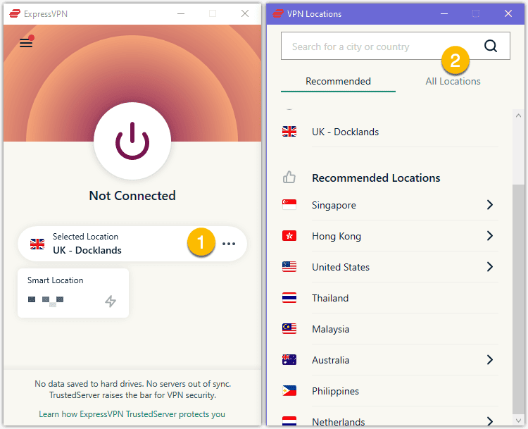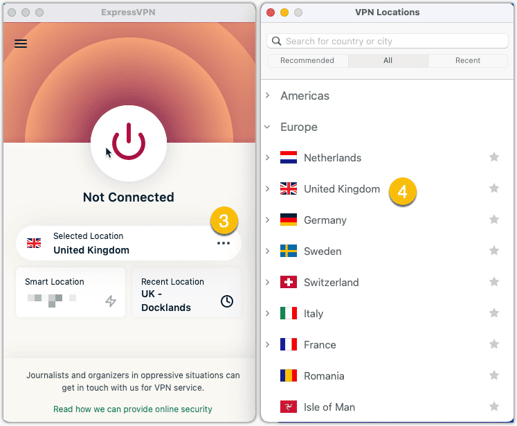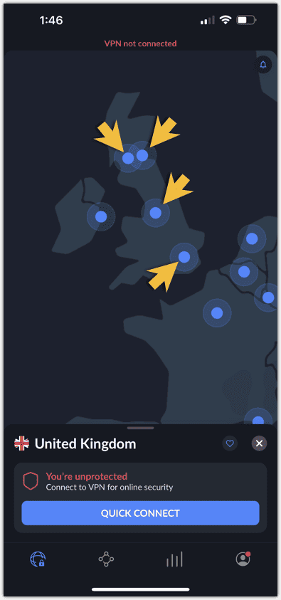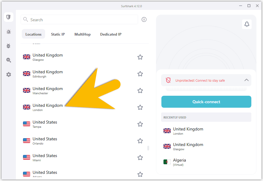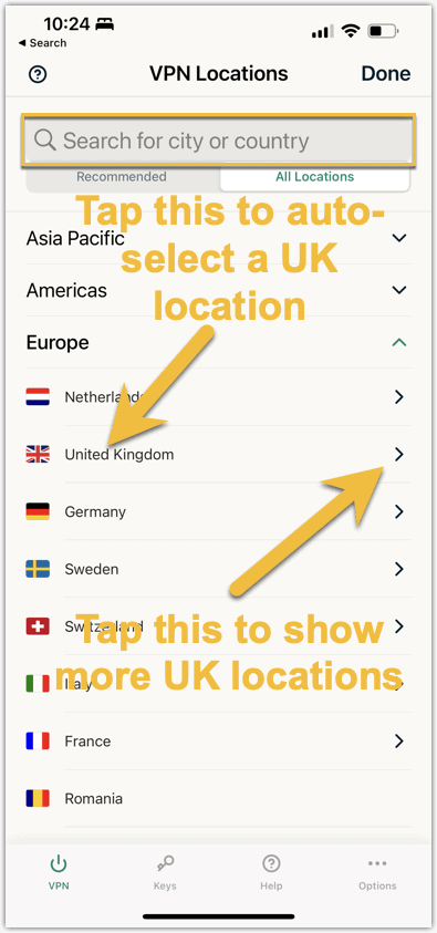 Alternatif olarak, listeyi kaydırarak ülkeye manuel olarak da gidebilirsiniz. İngiltere ve ABD gibi bazı ülkelerin birkaç yeri vardır. Bağlanmak için bir konumu tıklayın.