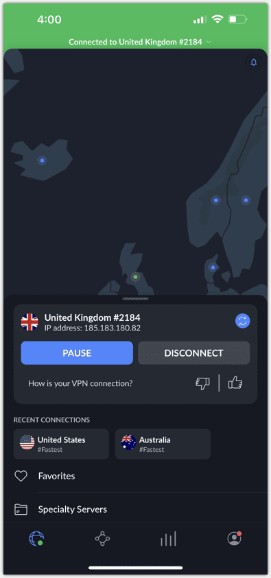 Quick Connect'e dokunduktan sonra, NordVPN, IP'nizi seçtiğiniz konumla ilişkili bir olarak değiştirmelidir. Aslında, bu Netflix ülkenizi bu konuma dönüştürecektir.