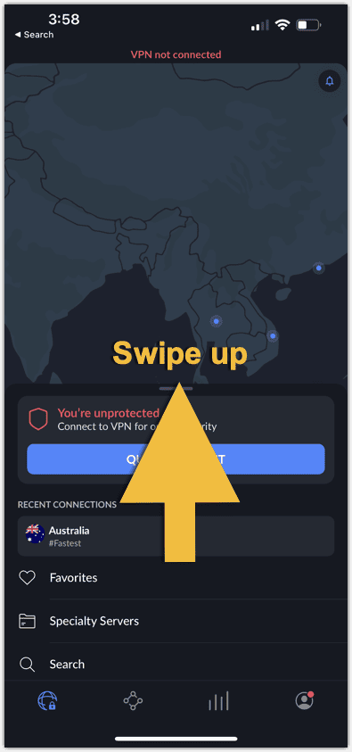 - Nordvpn uygulamasının ana ekranındaki alt paneli dokunun ve kaydırın