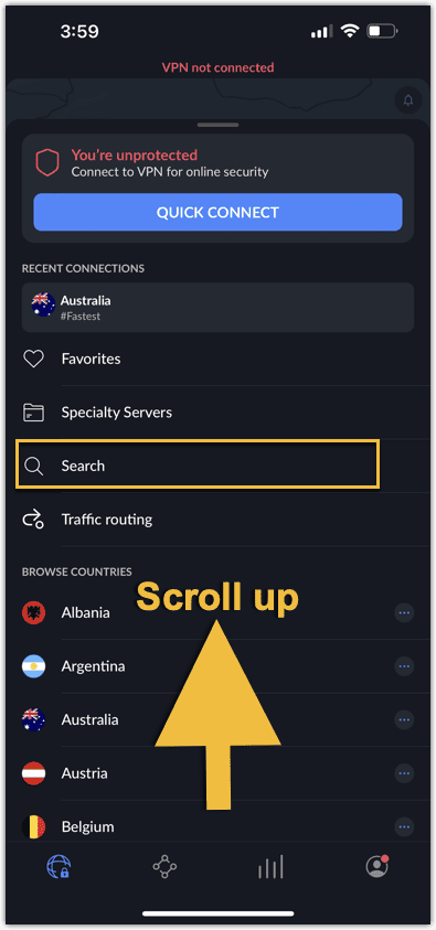 Alternatif olarak,Ülkeler listesinde kaydırarak ülkeye manuel olarak gidin.Bir ülkede belirli bir yer seçmek istiyorsanız, ülkenin sağındaki Elipsis sembolüne dokunun ve sonra bağlanmak için belirli bir yere dokunun. Aksi takdirde, hızlı bağlantı için istediğiniz ülkeye dokunun.
