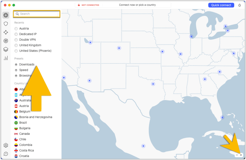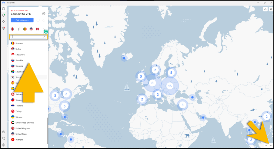 Yine başka bir seçenekNordvpn haritasında ülkeye gidin ve ardından istediğiniz ülkedeki konumu tıklayın.YapabilirsinBu ülkenin birden fazla sunucu konumu varsa haritadaki belirli bir konumu tıklayın.Bazen, diğer sunucu konumlarını görmeden önce haritanın sağ alt köşesindeki Plus (+) sembolünü tıklayarak yakınlaştırmanız gerekir.