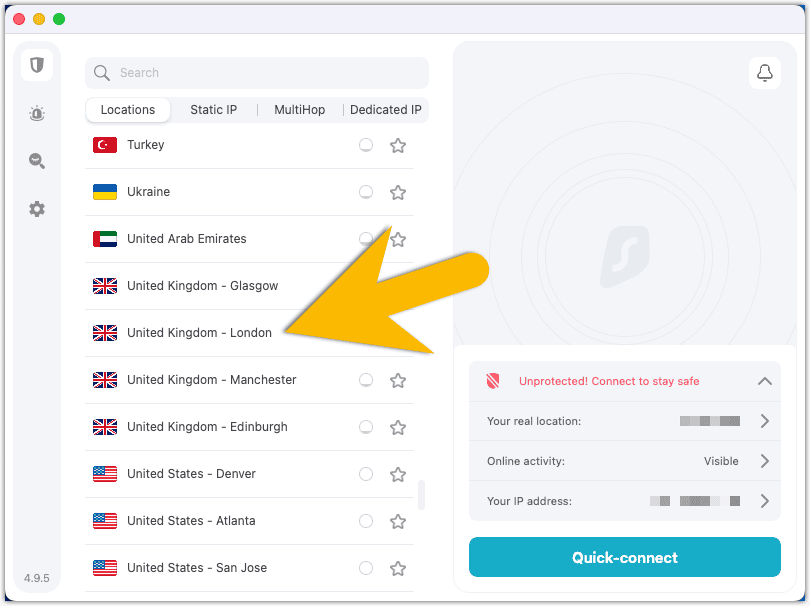 İstediğiniz konumu tıkladıktan sonra, Surfshark IP adresinizi seçtiğiniz konumla ilişkili bir adresle değiştirmelidir. Aslında, bu olacakNetflix bölgenizi değiştirino konuma.