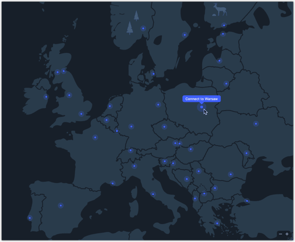 Yine başka bir seçenek, NordVPN haritasında ülkeye gitmek ve ardından istediğiniz ülkedeki konumu tıklamaktır. O ülke varsaBirden çok sunucu konumu, haritada belirli bir konumu tıklayabilirsiniz. Bazen, diğer sunucu konumlarını görebilmeniz için haritanın sağ alt korder üzerindeki Plus (+) sembolünü tıklayarak yakınlaştırmanız gerekir.