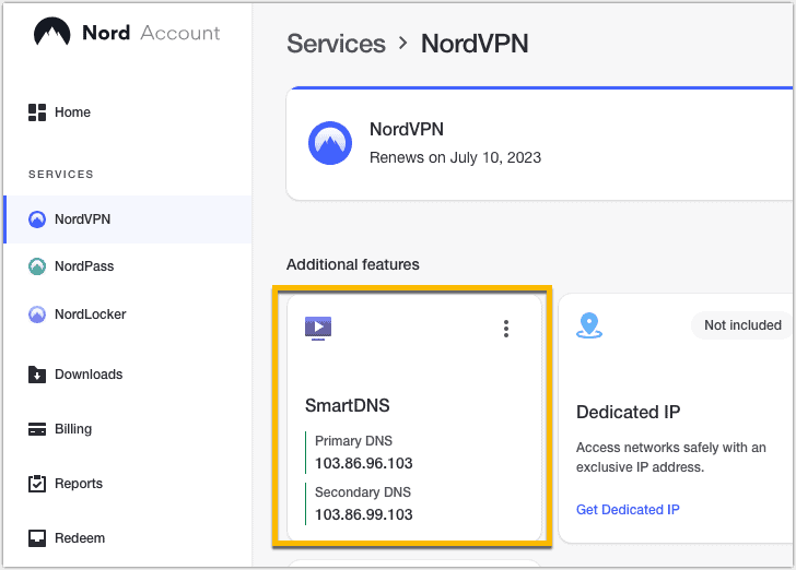- Geri dönünNordvpn Hesabı web tarayıcınızdaki veya oturum açmadıysanız sayfayı yenileyin.E -postanızda görüntülenen aynı birincil DN'leri ve ikincil DNS IP'lerini görmelisiniz.