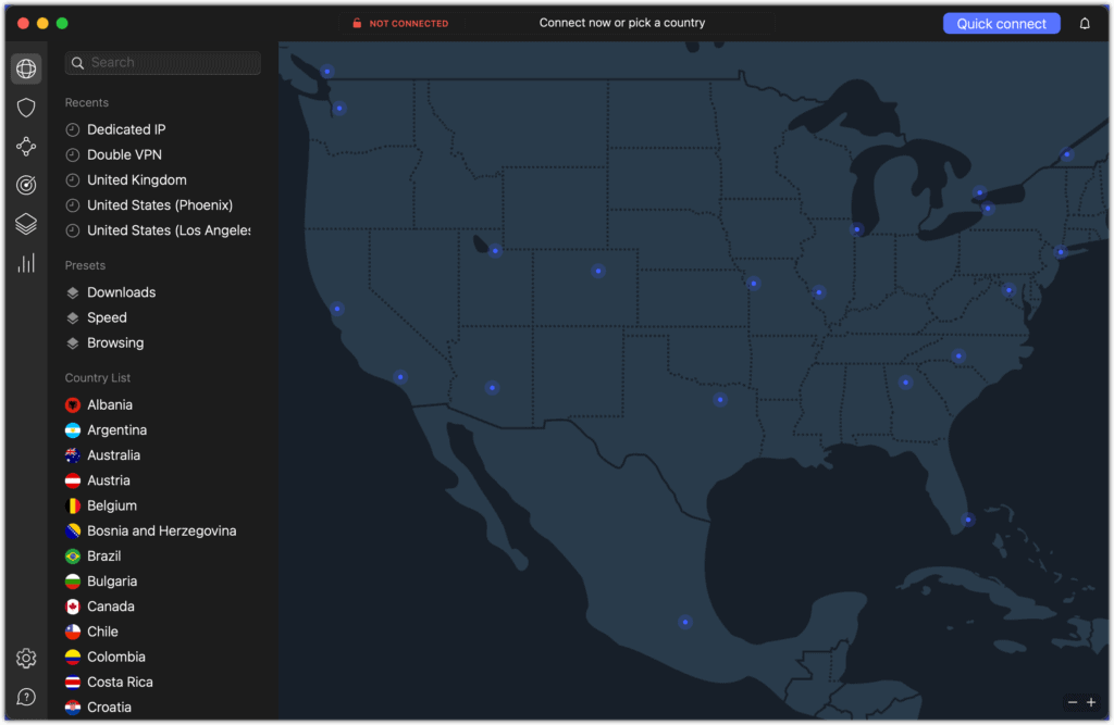 Bir VPN servis sağlayıcısı, dünya çapında yüzlerce hatta binlerce sunucu işletiyor.NordVPN uygulamasının bu ekran görüntüsündeki mavi noktalar, NordVPN'nin ABD'deki sunucu konumlarını gösteriyor.