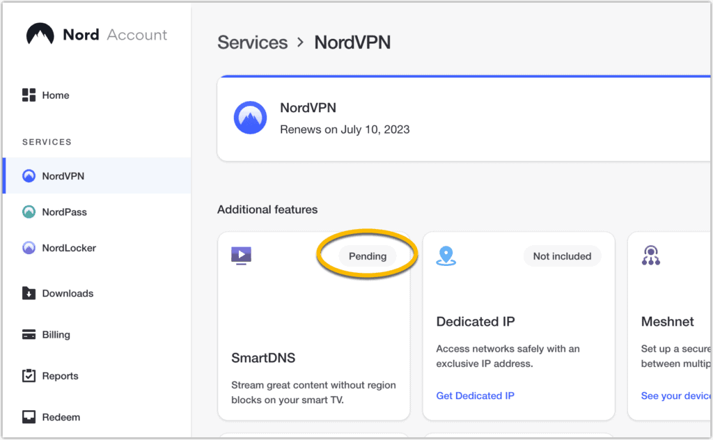 - SmartDNS kartı daha sonra bekleyen bir işaret göstermelidir.NordVPN SmartDNS'yi başarıyla etkinleştirdiğinizi gösteren bir e -posta alana kadar bekleyin.