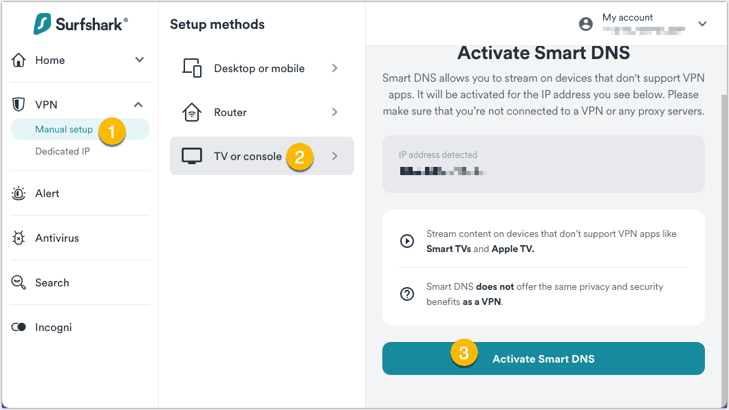 - İçeri girdikten sonra manuel kurulum> TV veya konsol> Akıllı DNS'yi etkinleştirin ve ardından Akıllı DNS Etkinleştir düğmesini tıklayın. Bu, SMARTTV'nizin harici IP'sini temizleyecek ve SmartDN'leri etkinleştirecektir.