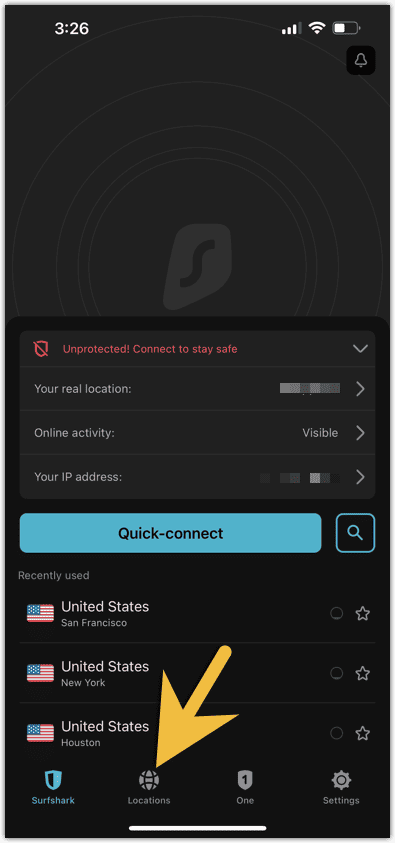 - DokunYerlerSurfshark uygulamasının ana ekranının altındaki menü