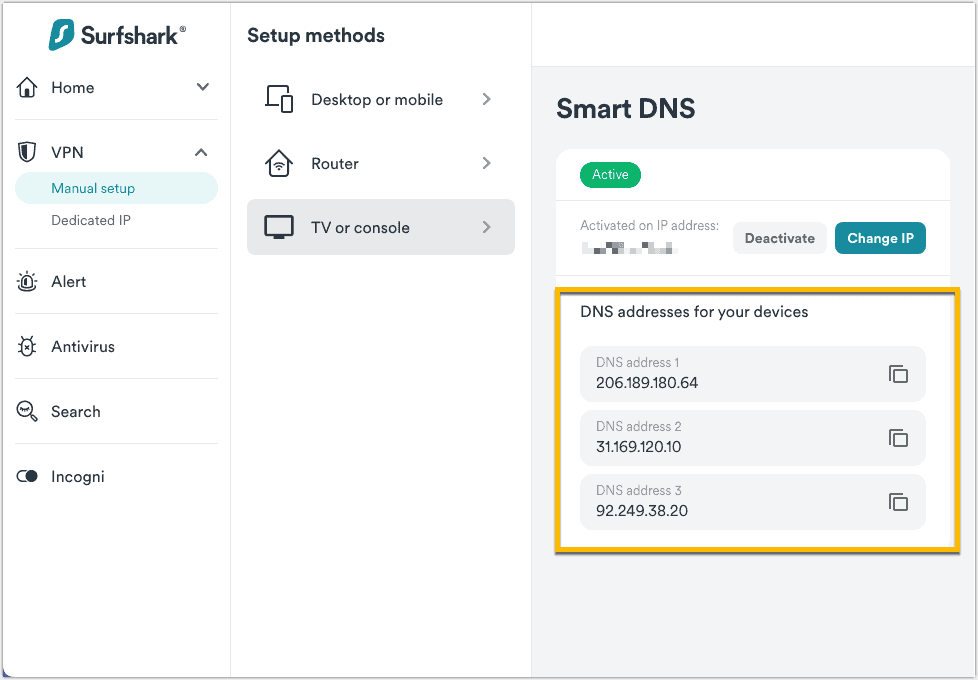 - Bu IP'leri kopyalayın. Artık SmartTV'nizi Surfshark'ın SmartDNS Proxy sunucularını kullanacak şekilde yapılandırmaya başlayabilirsiniz.