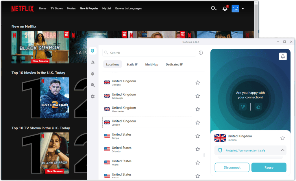 İstediğiniz yere dokunduktan sonra,Surfshark, IP'nizi seçtiğiniz konumla ilişkili bir olarak değiştirmelidir.Aslında, bu olacakNetflix ülkenizi o yere değiştirin.Bazen, bazı yerlerin değiştirilmesi gerekir. Sonunda bağlanana kadar tam konumu birden çok kez yeniden deneyebilir veya aynı ülkedeki diğer siteleri deneyebilirsiniz.